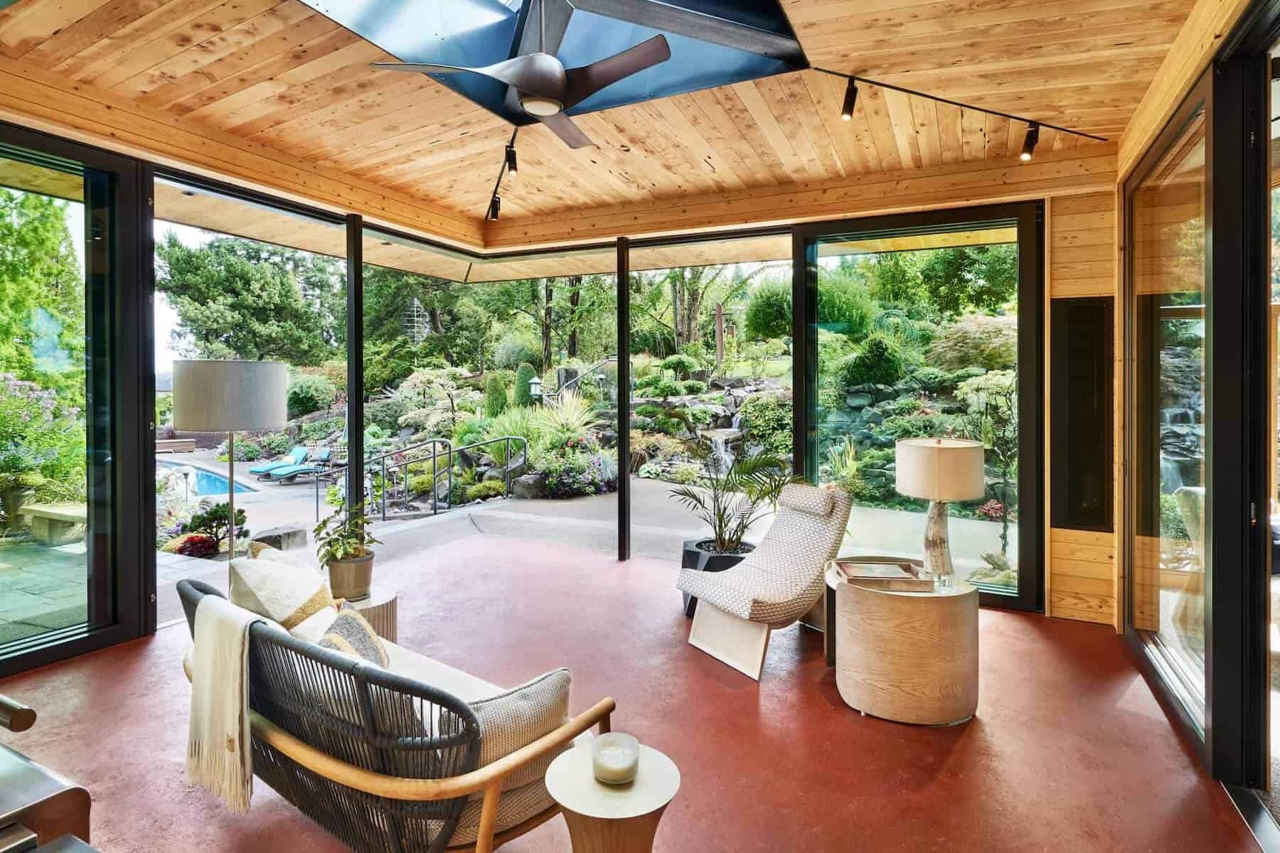 This renovation had a specific intent, which was to provide our client (and their guests) a four-seasons space from which to enjoy the beauty of their surroundings. Clean lines, natural finishes (like quarried stone, clay floor, sustainably harvested, local woods), and multi-panel lift-slide doors all conceal some of the most technically demanding square footage we’ve built.